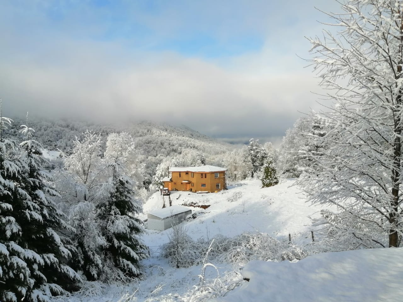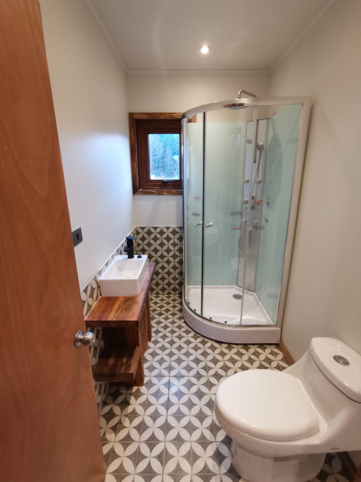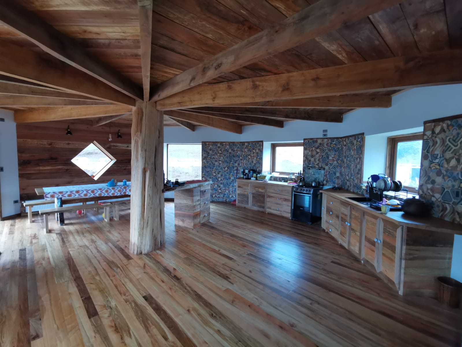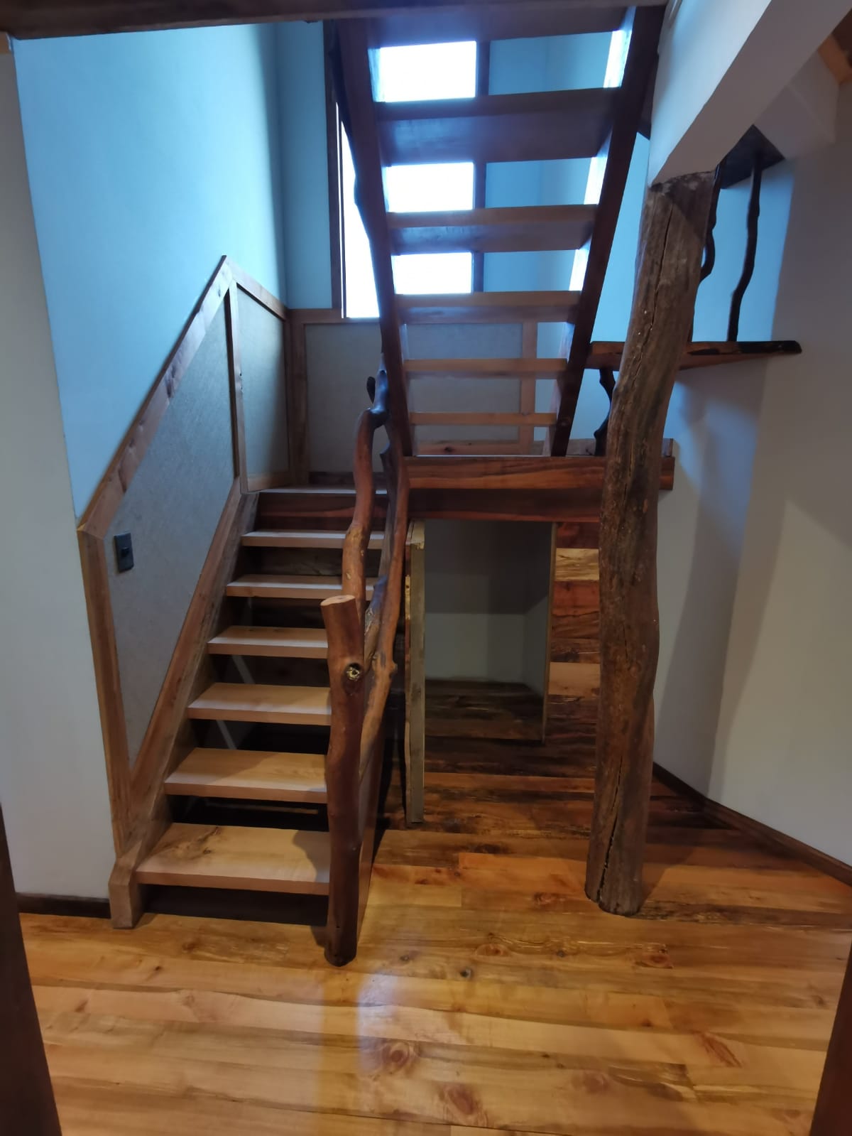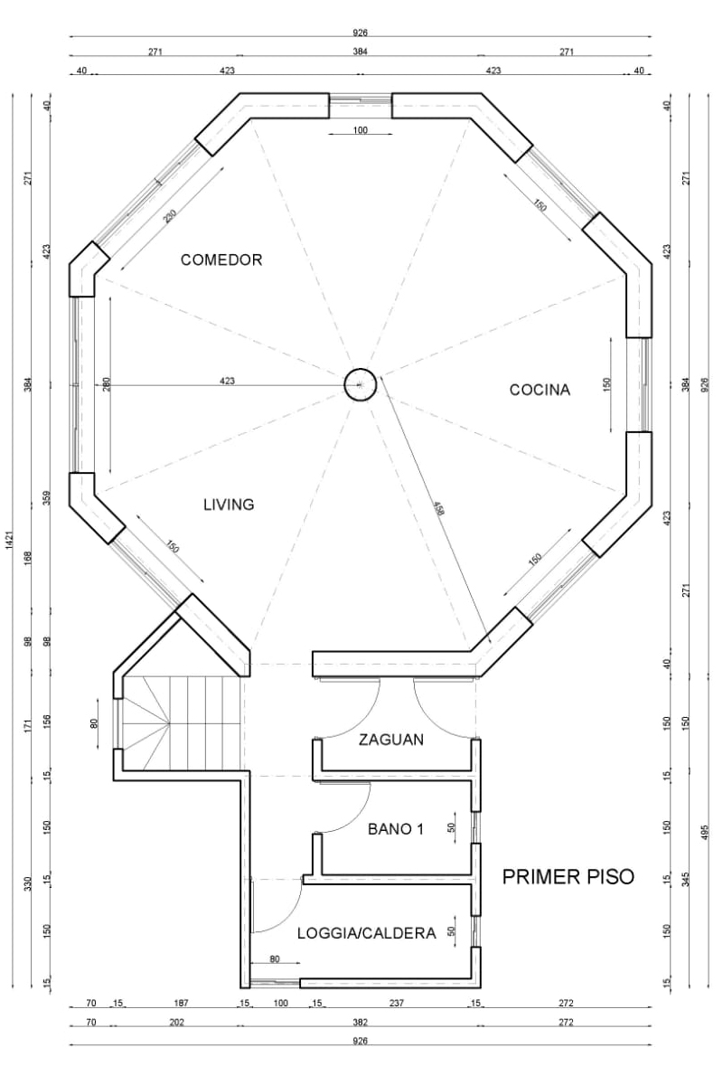 Octógono en ejecución de 150m2 en 2 plantas. Cimientos en fundación corrida, aislapol de alta densidad en piso, estructura de roble con aislación de fardos de paja y de lana de oveja (Bioaislan) en cielo. Pisos de roble en ambas plantas y porcelanatos en baños y loggia. Encamisado exterior y estuco Greb sobre malla proyectante. Fin de obra para el 12/23