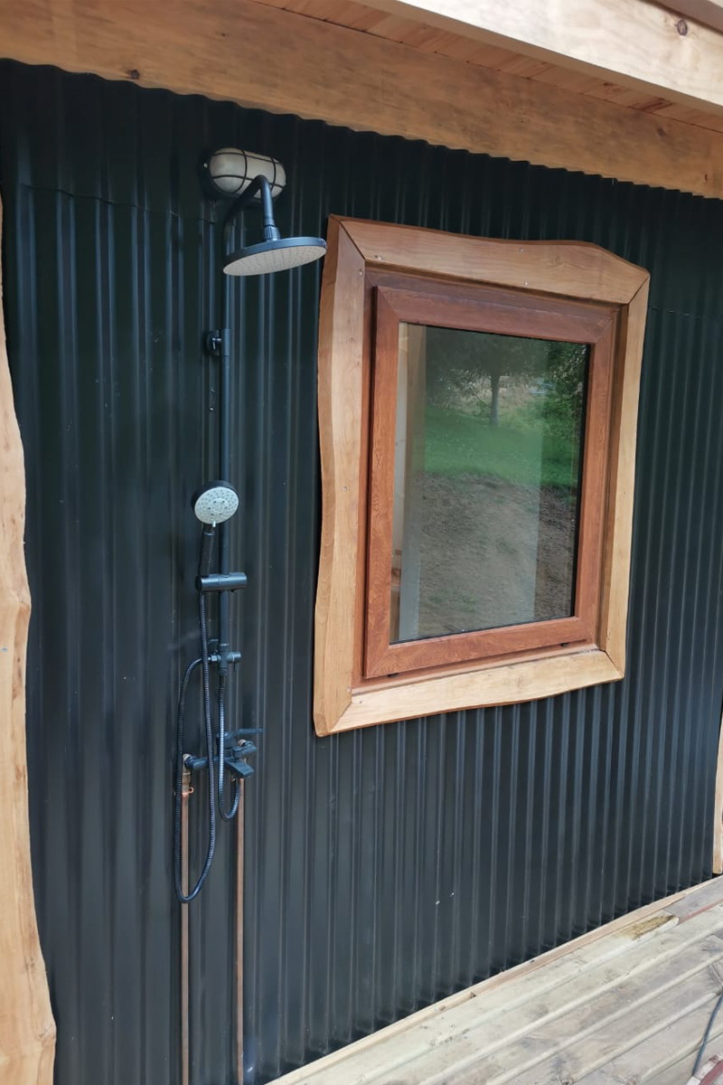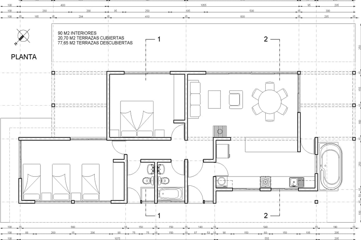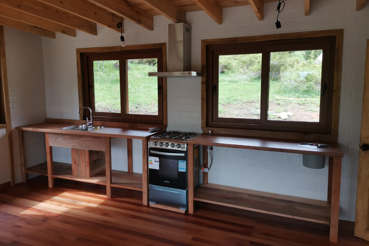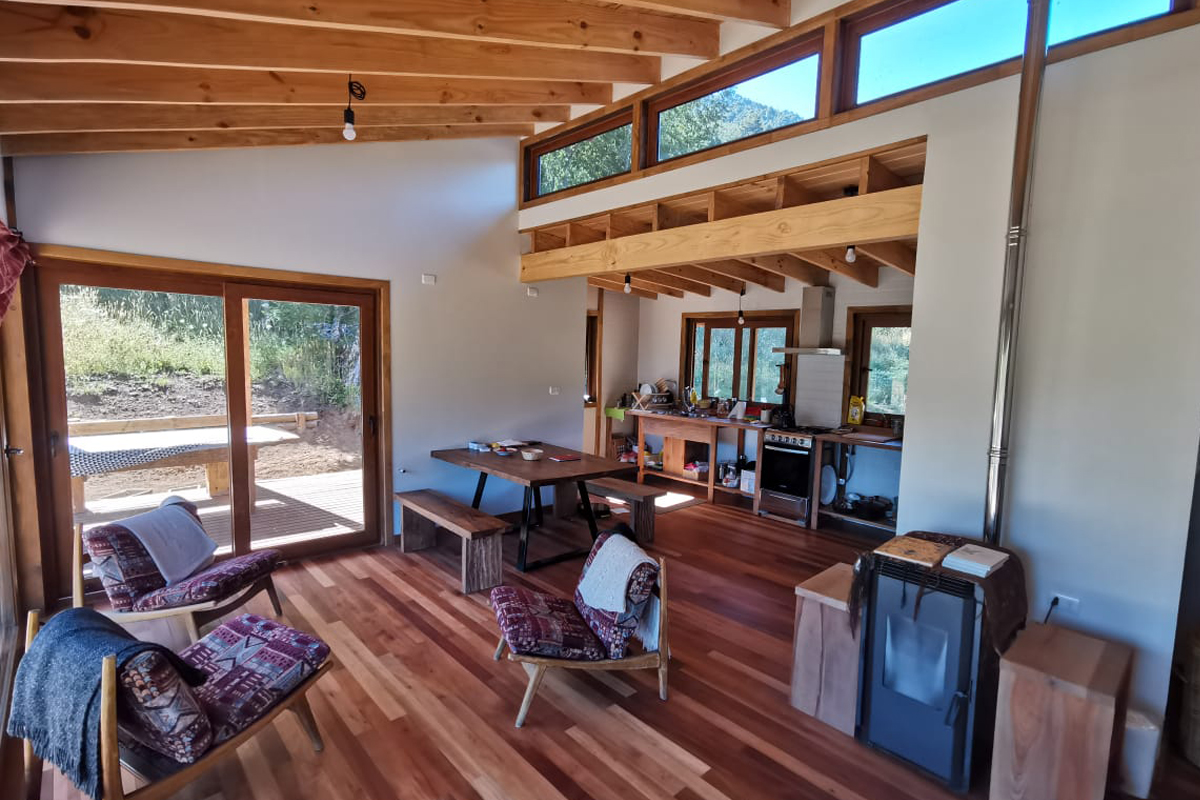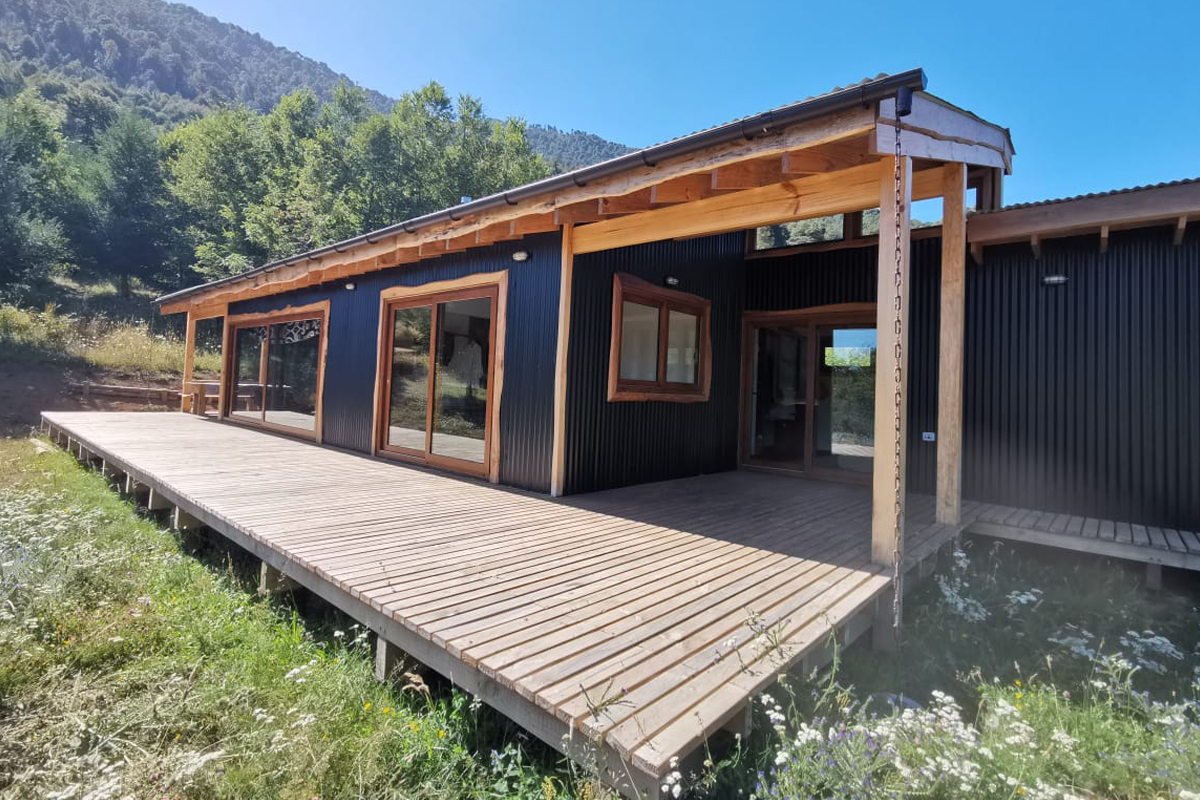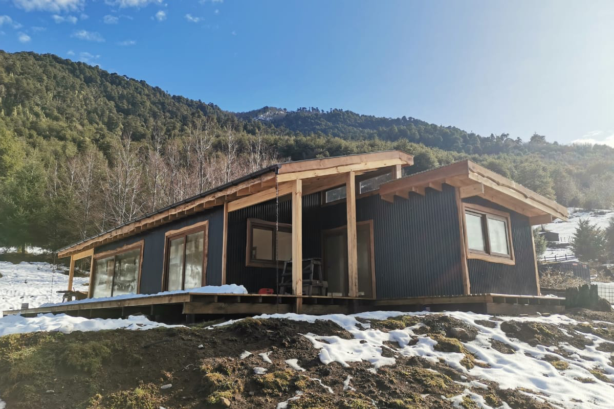 Casa sobre pilotes de pino impregnado en toda la construcción. Estructura de madera, aislación con lana de oveja en paderes y muros y de aislapol de alta densidad en piso. Muros de volcanita interior, zinc acanalado electro pintado exterior. Pinturas Osmos en maderas y terraza, piso de roble en toda la casa. Termopaneles color madera y techo de zinc negro electro pintado. Muebles de cocina a medida de raulí. Además se agregó una tinaja a gas en terraza.